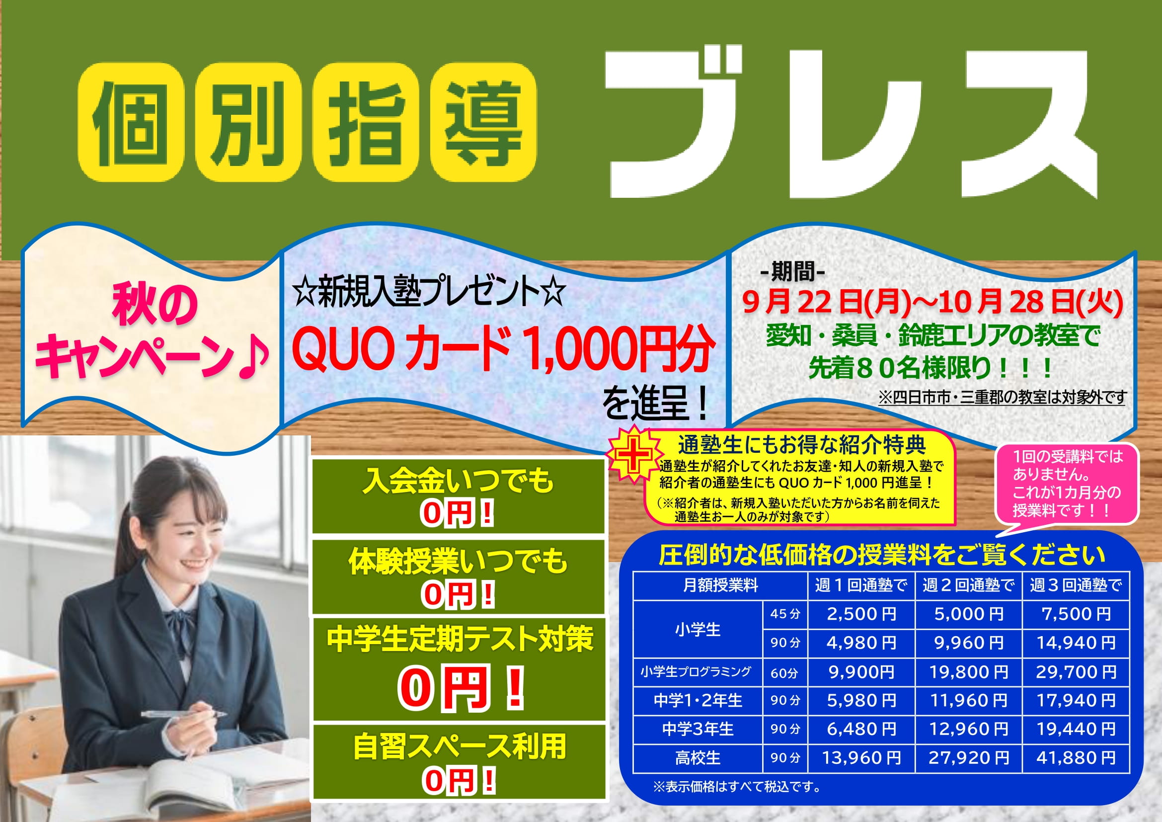 ※愛知・桑員・鈴鹿エリアの教室のみ対象。四日市市・三重郡の教室は対象外です。