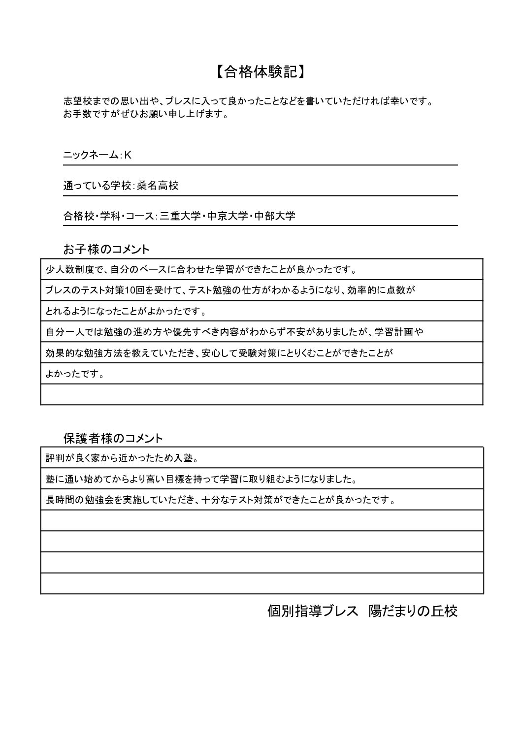 私は中学1年生の頃、定期テストは300点代、内申は34と、決して良いとは直えない成績でした。しかし、中学2年生になって 塾に入り、勉強をする習慣が身に付きました。そして、中学3年生にくなってからは、定期テストに400点代、内申は40と、成積を上げることができ ました。塾に入って良かったと思うことは、分からないところを好きな時に聞けて、分かるまで徹底的に教えてくれるところです。受験期になってからは、 塾に毎日のようにく通い、苦手な数、理、社を中心に頑張りました。その結果、絶対に受かると思っていなかった国際文理科に合格することができました。今まで塾で努力してきて良かったです。2年間本当にありがとうございました。