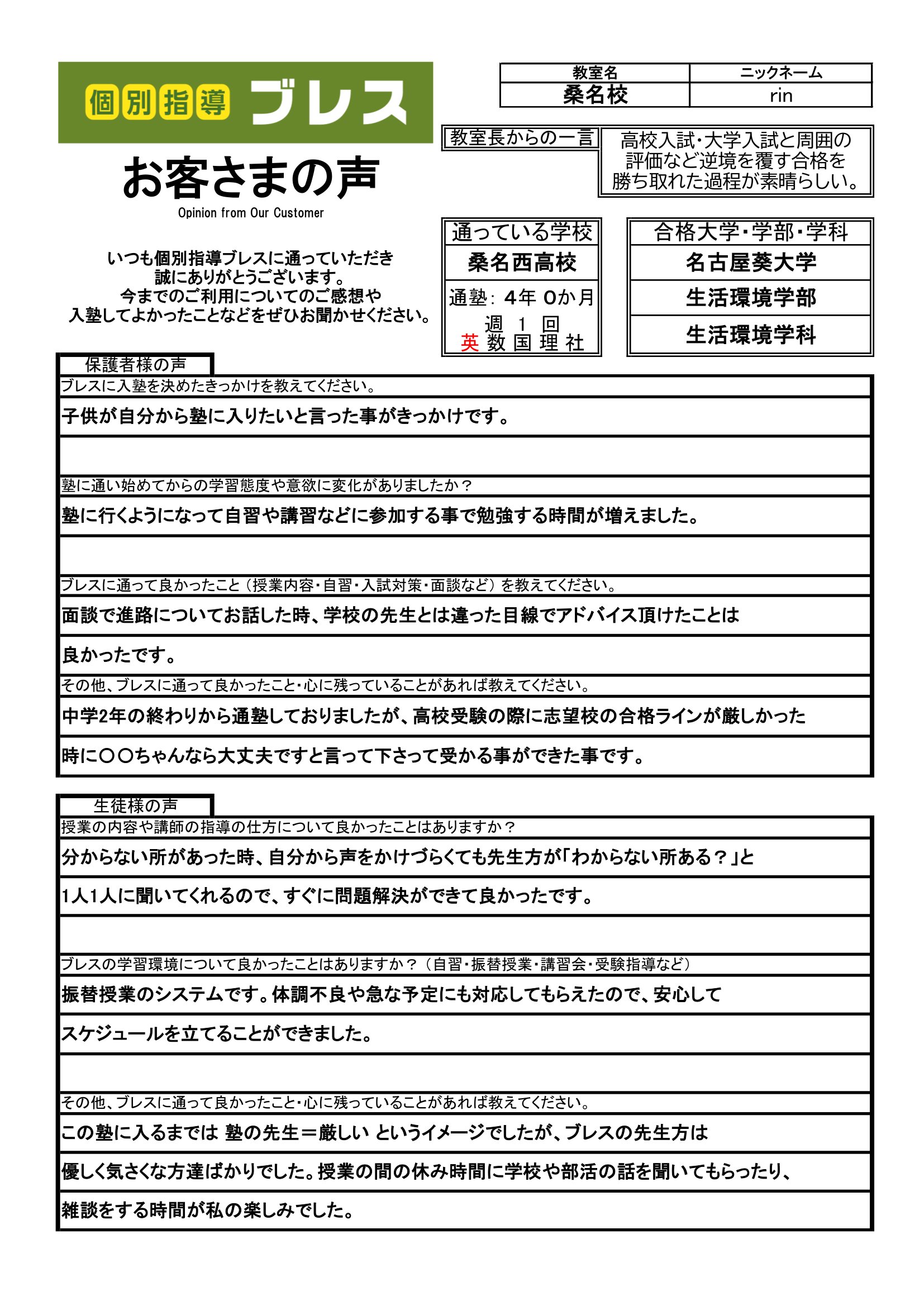 私は中学1年生の頃、定期テストは300点代、内申は34と、決して良いとは直えない成績でした。しかし、中学2年生になって 塾に入り、勉強をする習慣が身に付きました。そして、中学3年生にくなってからは、定期テストに400点代、内申は40と、成積を上げることができ ました。塾に入って良かったと思うことは、分からないところを好きな時に聞けて、分かるまで徹底的に教えてくれるところです。受験期になってからは、 塾に毎日のようにく通い、苦手な数、理、社を中心に頑張りました。その結果、絶対に受かると思っていなかった国際文理科に合格することができました。今まで塾で努力してきて良かったです。2年間本当にありがとうございました。