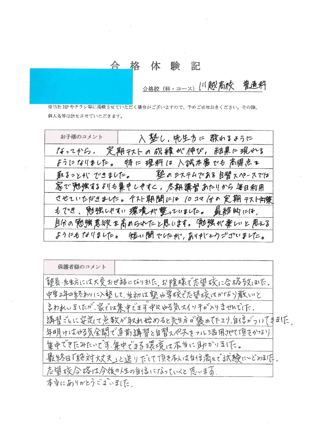 入塾が遅かったため、受験までに間に合うか心配でしたが、苦手な数学・理科を丁寧に指導頂き、ずいぶん克服する事が出来たと思います。