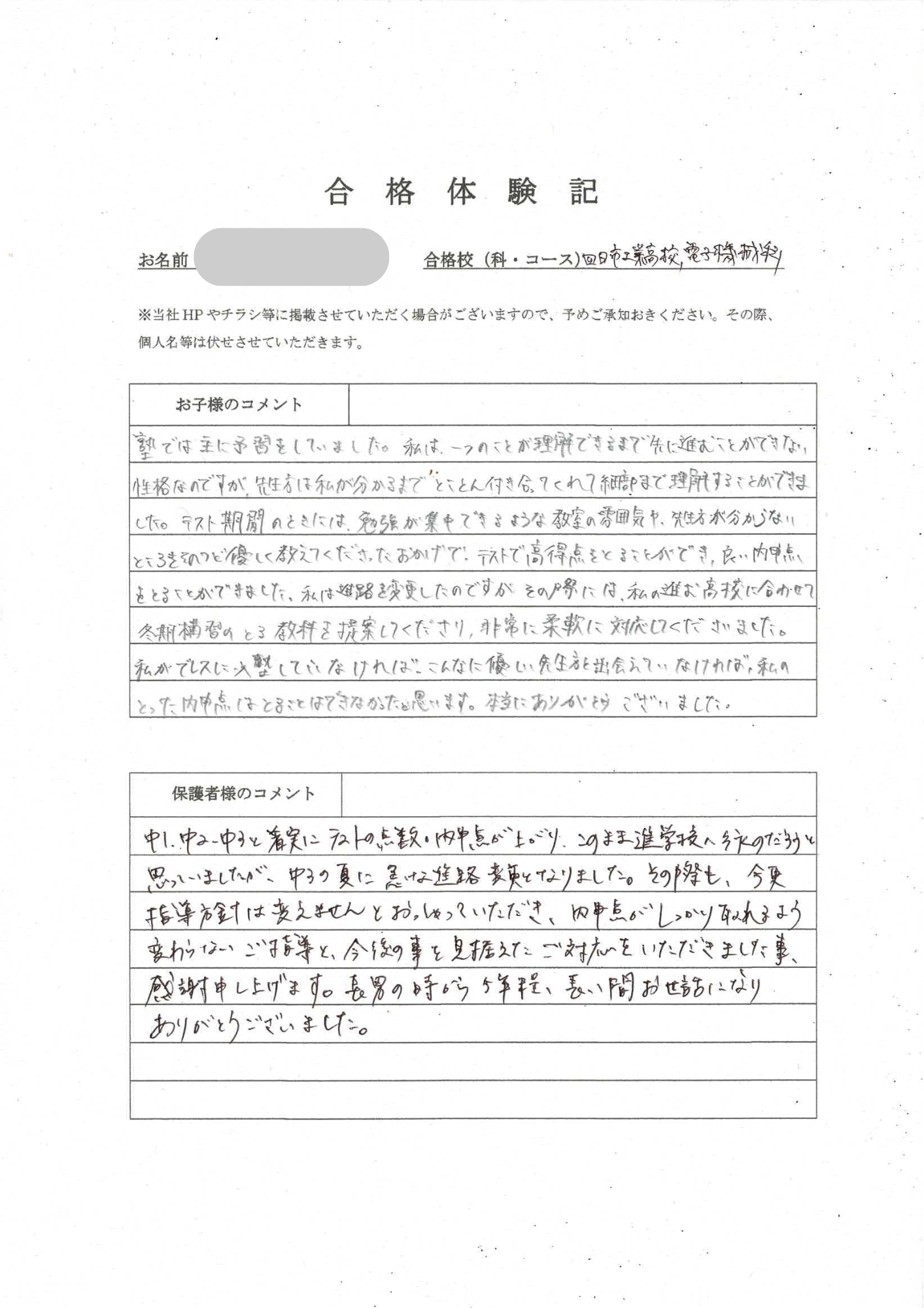 中1・中2・中3と着実にテストの点数・内申点が上がり、このまま進学校へ行くのだろうと思いましたが、中3の夏に急な進路変更となりました。その際も、今更指導方針は変えませんとおっしゃっていただき、内申点がしっかり取れるよう変わらないご指導と、今後の事を見据えたご対応をいただきました事、感謝申し上げます。長男の時から5年程、長い間お世話になりありがとうございました。