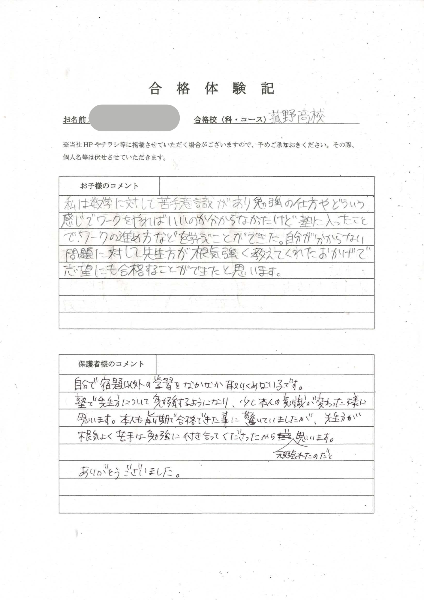 【保護者様のコメント】