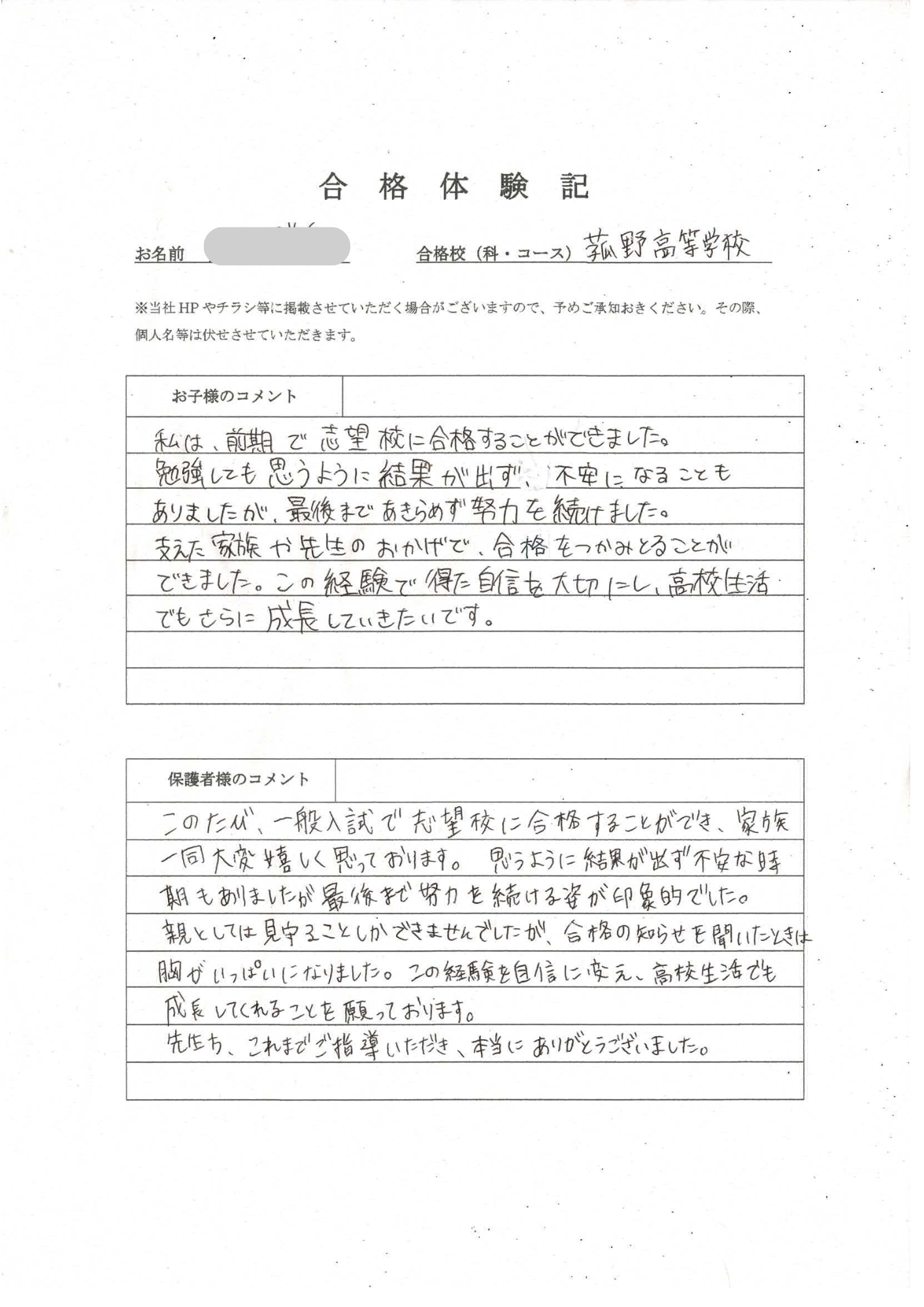 このたび、一般入試で志望校に合格することができ、家族一同大変嬉しく思っております。