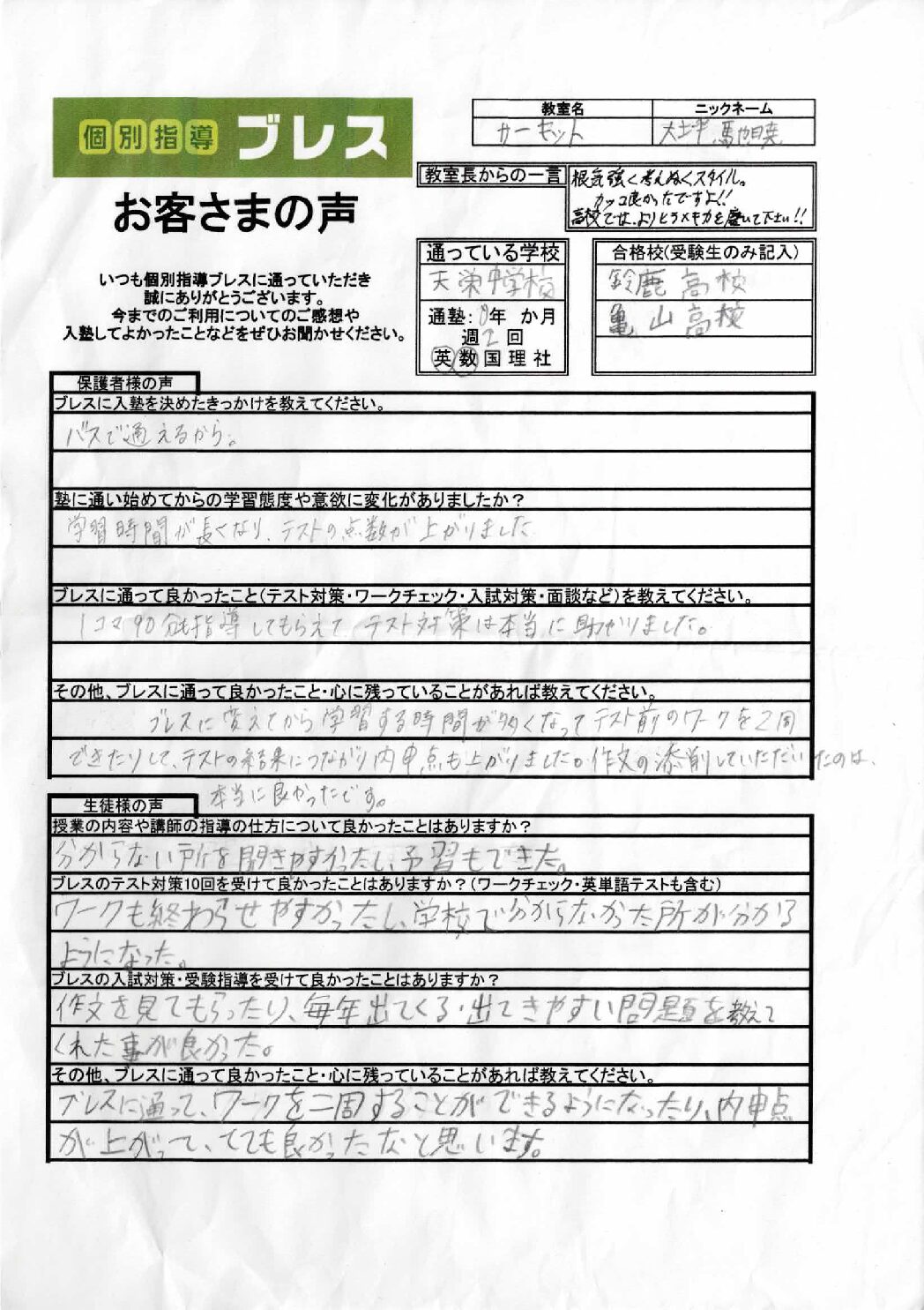 ブレスに変えてから学習する時間が増えて、テスト前のワークを2周できたりして、テストの結果につながり内申点も上がりました。作文の添削していただいたのは、本当に良かったです。