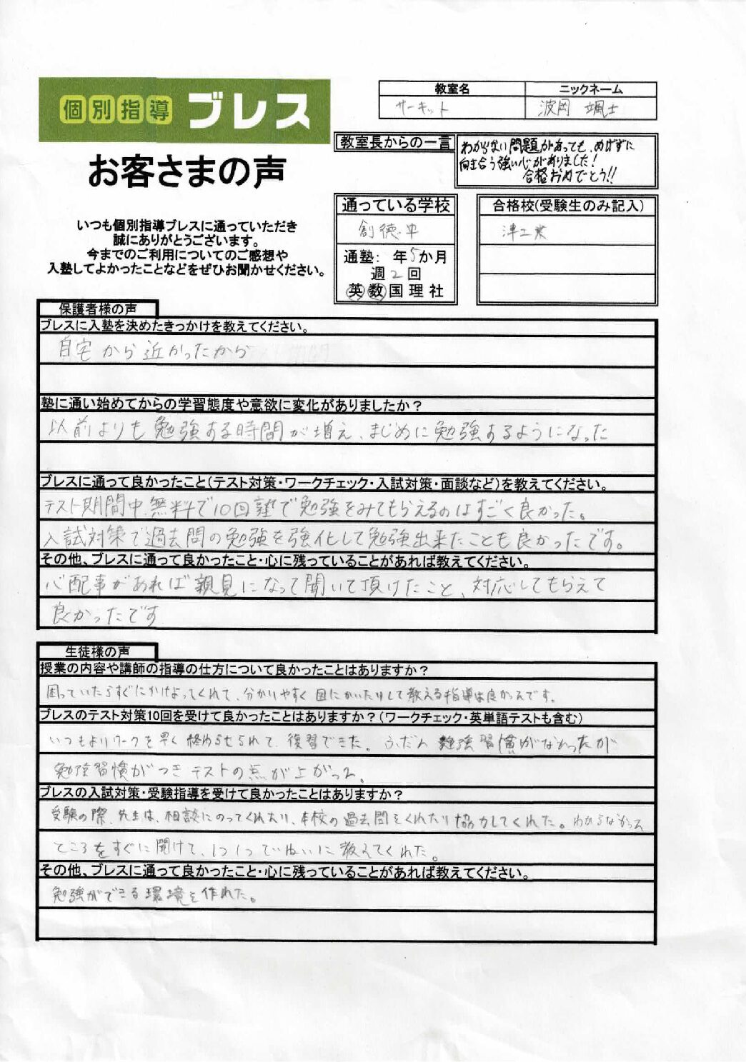 (保護者様のコメント)