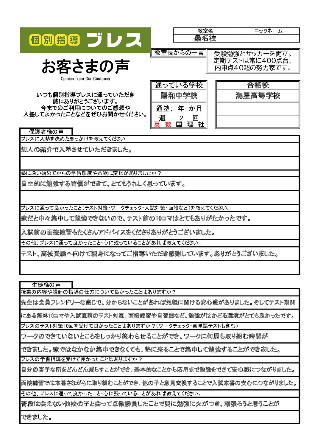 テスト、高校受験へ向けて親身になってご指導いただき感謝しています。ありがとうございました。